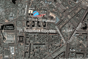 Космонавтов. Пересечь парк, далее на троллейбусе N9, 37 или трамваем №11, 17 в сторону Телецентра «Останкино» до остановки Аргуновская улица (три остановки). Далее пройти по ходу трамвая до светофора (до пересечения ул. Аргуновской и ул. Ак. Королева). По переулку Выйти на 1-ю Останкинскую улицу, затем повернуть на Хованскую улицу (указатель - Хованский вход ВВЦ), далее пройти до высокого кирпичного здания (дом №6 ) за забором и с охраной, 3 подъезд (с колоннами)