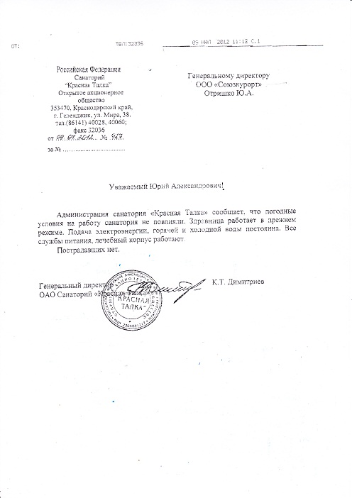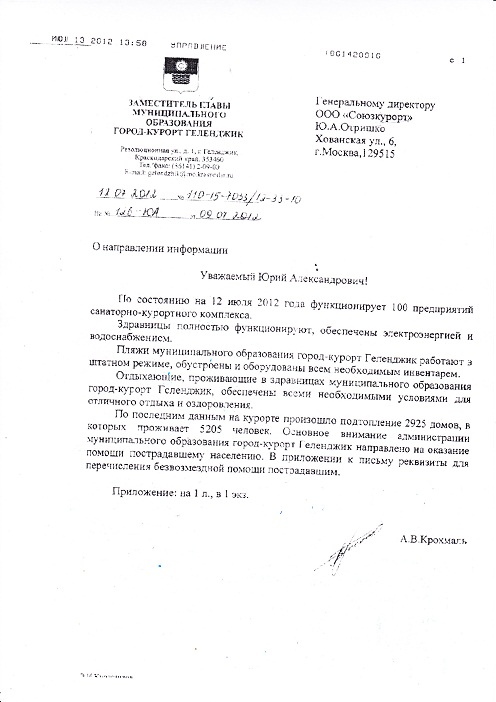 ООО “Союзкурорт” считает правильным и возможным оказать помощь г.Геленджику, пострадавшему во время ЧС.