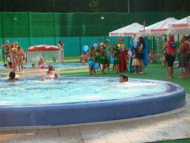 Аквапарк включает в себя бассейны с бегущей волной, зелеными островами, фонтанами, водопадами. Для маленьких посетителей — детский бассейн с игровой площадкой и качелями. Многочисленные головокружительные горки, спуски, тоннели, лабиринты. А главное — весь комплекс бассейнов с морской водой! А если вам захочется отдохнуть от аттракционов — в вашем распоряжении площадки солярия с удобными шезлонгами.