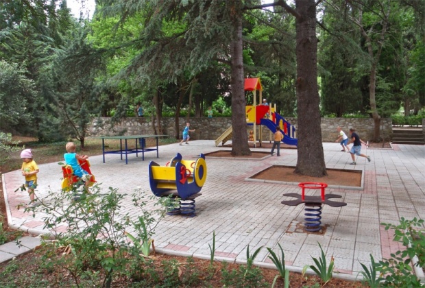 Территория санатория это прекрасный парк с фонтаном, цветочными клумбами, розарием, оливковой рощей, кипарисовой аллеей и рядами вечнозеленых самшитов и елей. В тени парка расположены удобные скамейки для отдыха. На протяжении сезона можно наблюдать цветение ароматных крымских роз.
