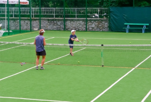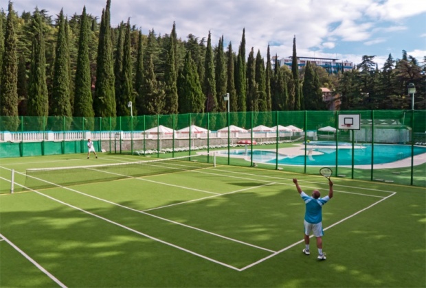 Территория санатория прекрасна, много зелени, лавочек. Бассейн, который спасает когда на море шторм, есть бильярдная и теннисный корт. К минусам могу отнести отсутствие мест для детских игр, одной детской площадки мало.