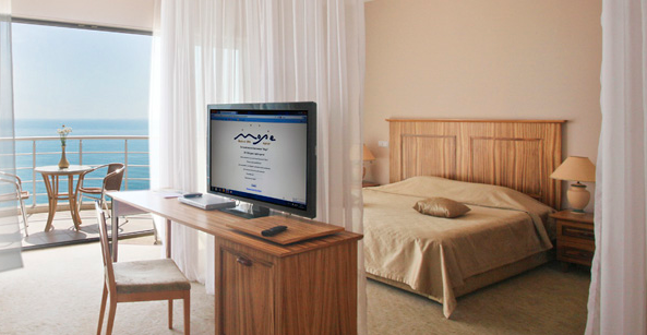 Номера без балкона или с французским балконом. Вид из номера - на море или бассейн.