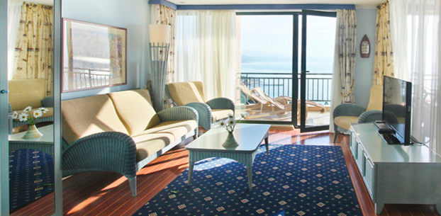 Номер условно разделен на две зоны: гостиную и спальную. Номер с большим балконом, с которого открывается панорамный вид на море. Максимальное количество человек: основные места - 2, дополнительное место - 1.
