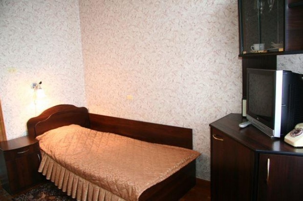 В номере - стандартный набор мебели: кровать, стол, стулья, тумбочку, сервант угловой с посудой, зеркало, бра, телевизор, холодильник, телефон, встроенный шкаф. На стенах обои, на полу паркет, коврик. Санузел совмещенный: ванна и туалет. Окна одноместных номеров выходят в парк. Все одноместные номера без балконов.