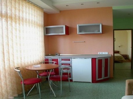 В номере: местный со всеми санитарными удобствами, душ, туалет, умывальник, 2 кровати, раскладной диван или кресло-кровать, 2 тумбочки, шкаф для одежды, кондиционер, лоджия, холодильник,мини кухня, телевизор.(Т, У, Д, ТВ, Х, кондиционер)