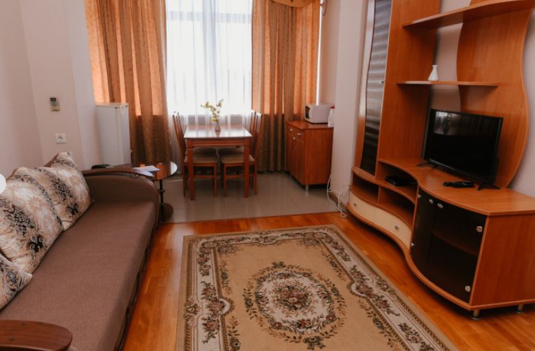 Этот уютный и светлый номер идеально подойдет для семьи из 3-х или 4-х человек. Он состоит из небольшой прихожей и двух комнат: гостиной и спальни. В спальне находится кровать, шириной 1.60 см, а в гостиной - раскладывающийся двухместный диван. К тому же в данной категории номера присутствует миникухня с отдельной зоной, которая включает в себя микроволновую печь, холодильник, чайник, набор столовых предметов и посуды. Если вы будете отдыхать с маленькими детьми, это значительно облегчит родительские будни. С балкона открывается потрясающий вид на парк санатория. Для вашего удобства предоставляются махровые халаты, наборы полотенец, одноразовые тапочки и мини-набор косметических средств.