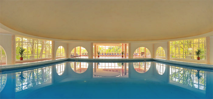 Размер чаши бассейна 17,5 х 17,5 м, он заполнен пресной водой и оснащен элементами гидромассажа, температура воды составляет + 28С.