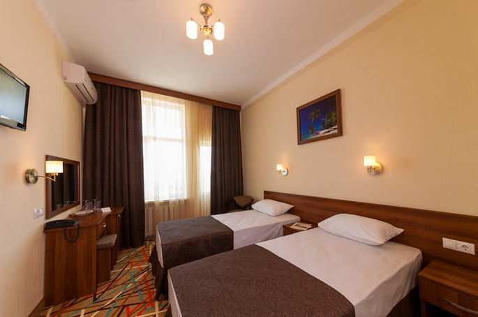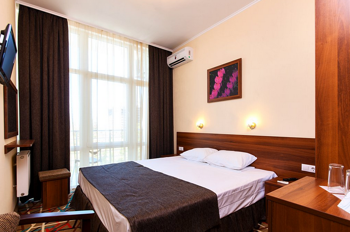 Однокомнатный двухместный, ванная комната с набором полотенец, фирменной косметикой и феном душевой кабиной, сплит-система, укомплектованный мини-бар, телевизор, телефон, мини-сейф, балкон.