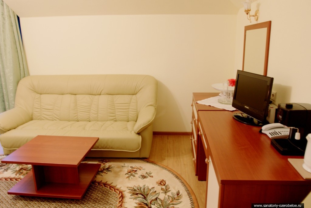 Размещение: Номерной фонд санатория (1233 места) расположен в двух жилых корпусах и коттеджном городке, представлен двухместными номерами со всеми удобствами, одноместными номерами, номерами категории «полулюкс», «люкс» и апартаментами.
