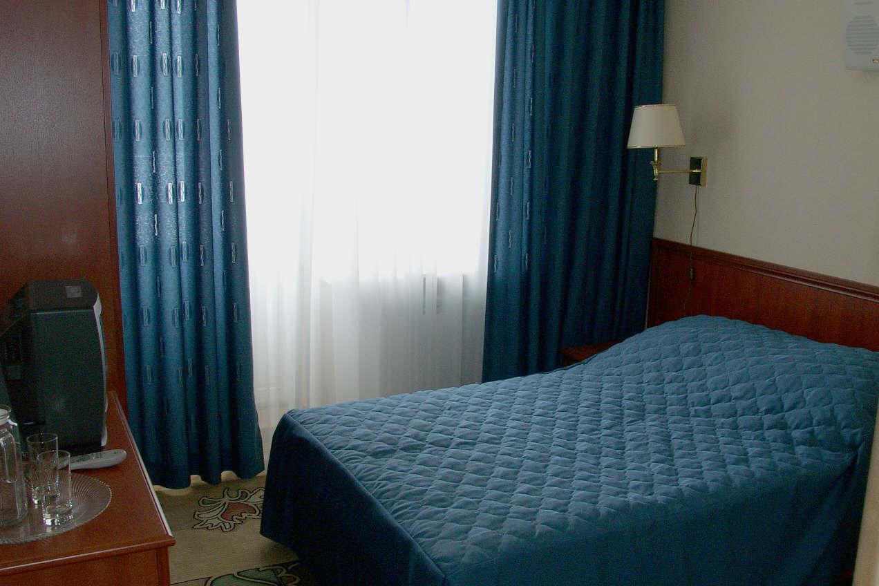 Однокомнатный номер со всеми удобствами с балконом (холодильник, телевизор, душ, совмещенный с санузлом, 2 кровати раздельных, 2 тумбочки, шкаф для одежды и обуви, 2 пуфа, посуда: графин, 2 стакана; половое покрытие - паркет). Дополнительное место - мягкая раскладушка - возможно только при письменном согласии гостя (номер тесный, рассчитан на 2 человека).