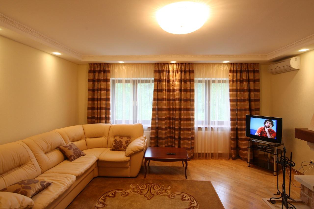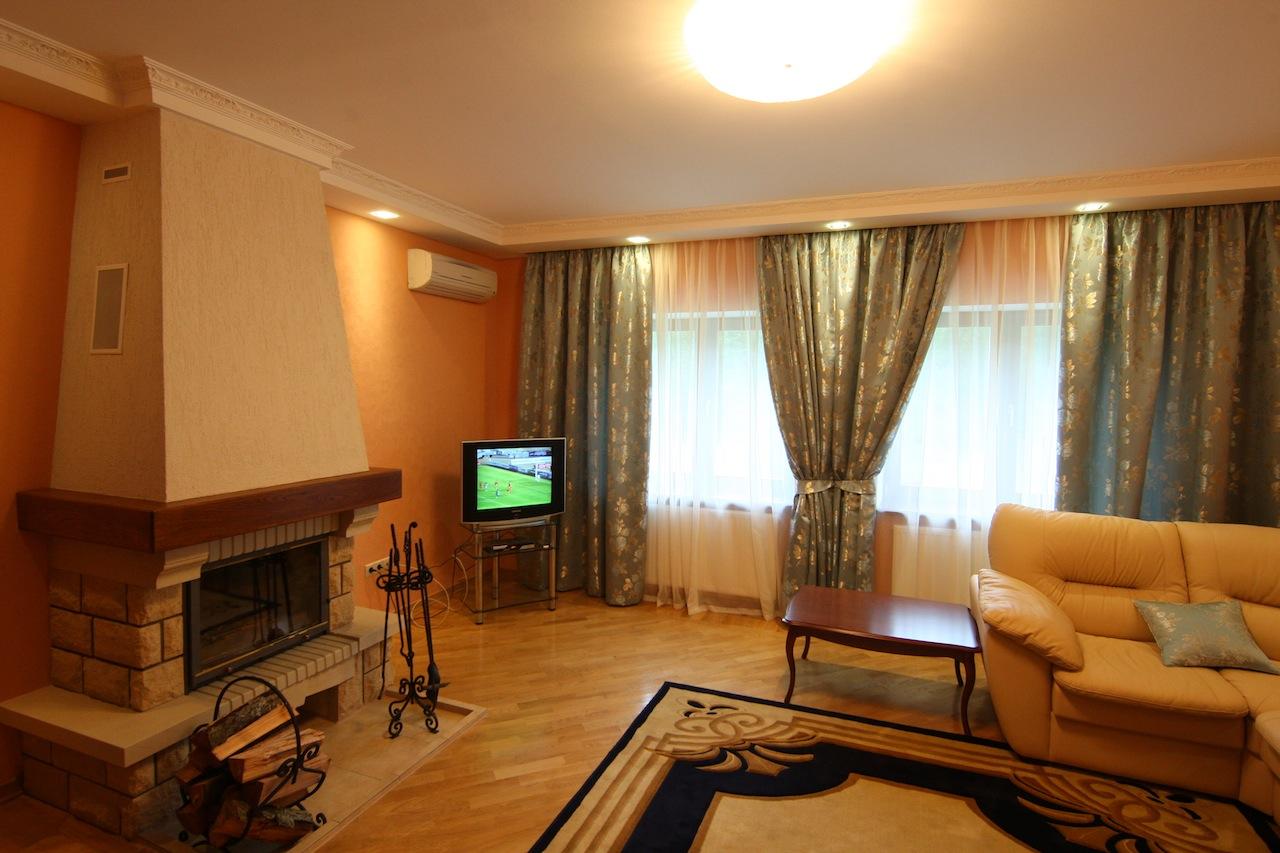 На 1 этаже: гостиная, спальная комната (кровать двухспальная), кухня-столовая (холодильник кондиционер, СВЧ-печь, электроплита, необходимая посуда), большая ванная комната с джакузи, биде и санузлом; комплекс с встроенной сауной (парная, душевая, комната отдыха, туалет), 2 террасы; стиральная машина, утюг; на 2 этаже: гостиная с действующим камином (угловой диван раскладывается на 2 основных места), спальная комната (кровать двухспальная), гардеробная, гостевая комната либо кабинет (комната удобна для 1 ребенка - имеется кровать 1 спальная, стол, стул), большая ванная комната с джакузи, биде и санузлом.