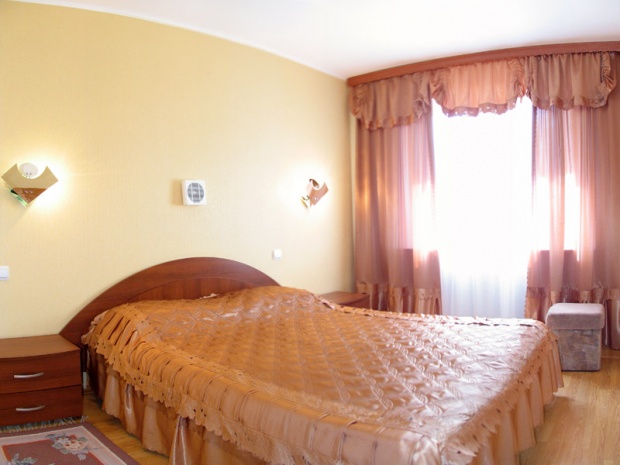 Спальня: 2-спальная или две 1,5-спальные кровати, тумбочки, бра, коврики, туалетный столик, два встроенных платяных шкафа, кондиционер, радио, выход на балкон (летняя мебель).
