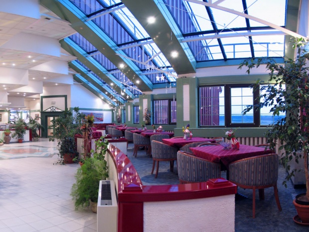 В пансионате широкое разнообразие ресторанов и баров. Трехразовое питание, которое входит в стоимость путевки осуществляется в большом зале ресторана. Для гостей пансионата ежедневно составляется вкусное и полезное меню с обязательным включением в рацион свежих овощей и фруктов. Дизайн зала выполнен в цвете фуксии, а так же в коричневых и белых тонах. Из окон можно наблюдать панорамный вид территории.
