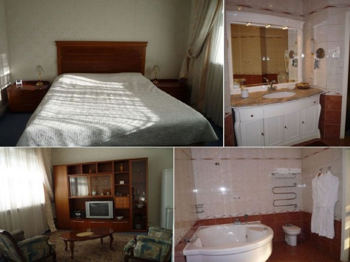 В номере: двуспальная кровать, ТВ, холодильник, телефон, шкаф, сейф, чайник, посуда, музыкальный центр, утюг, фен, халаты, в ванной душ.