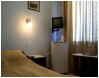 Одна комната, две раздельные кровати, телевизор, холодильник, электрочайник, чайный сервиз, посуда, санузел (ванна, душ, туалет, раковина). Утюг, фен (у горничной). Площадь 22 кв. м.