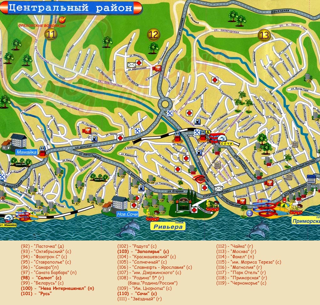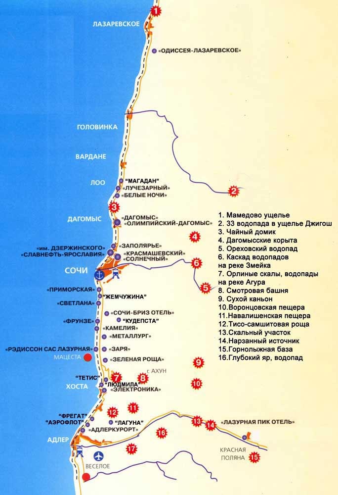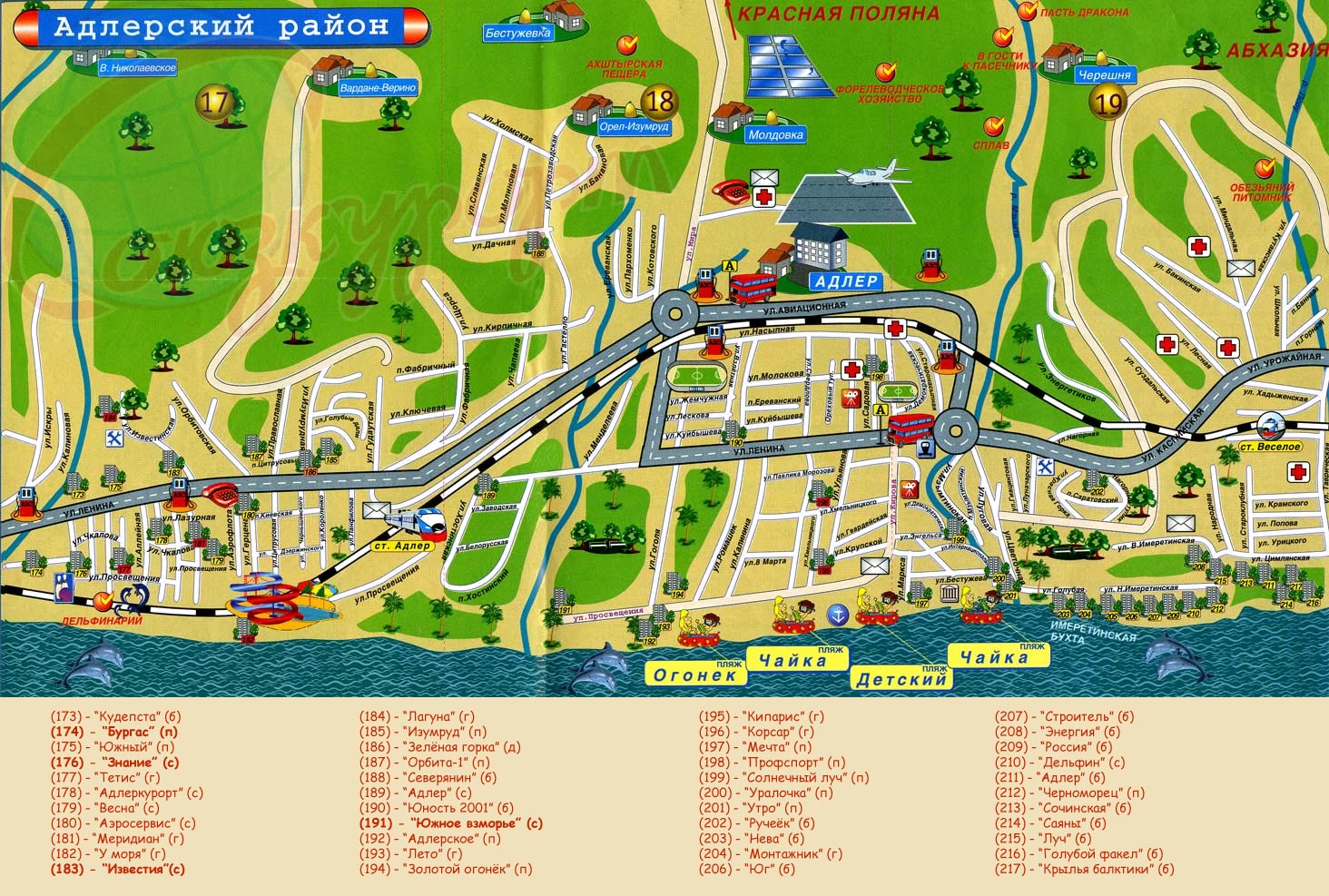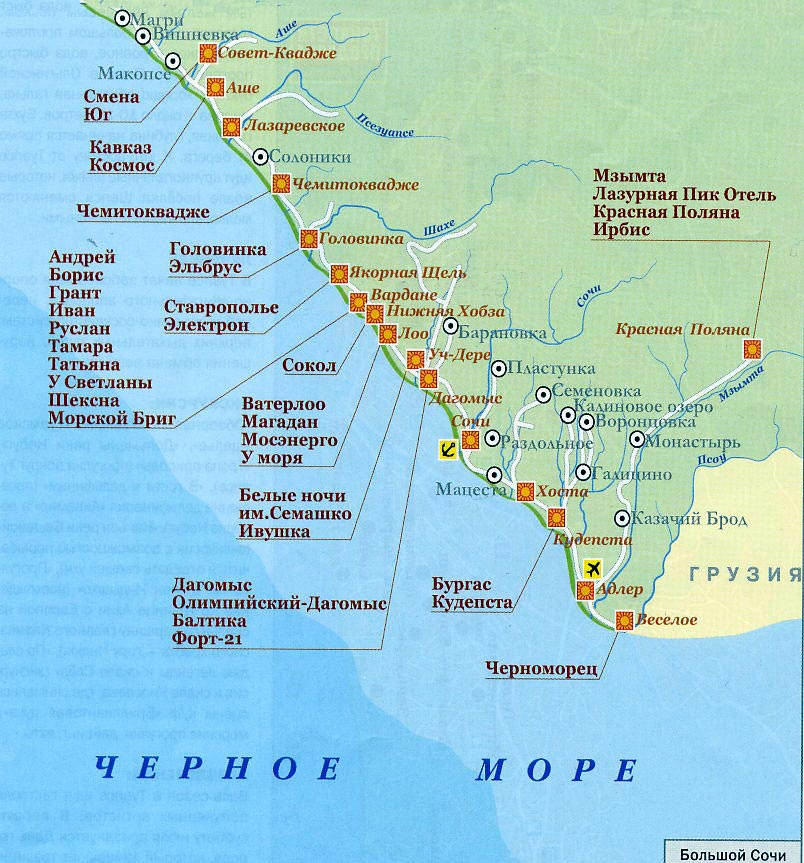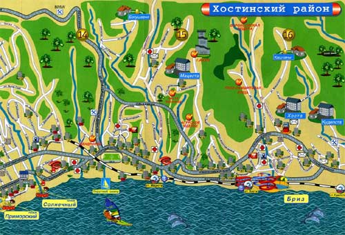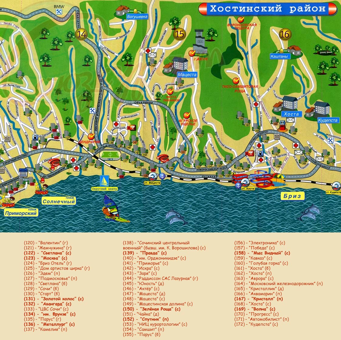 На карте представлены Лазаревский, Центральный, Хостинский и Адлерский районы Большого Сочи.