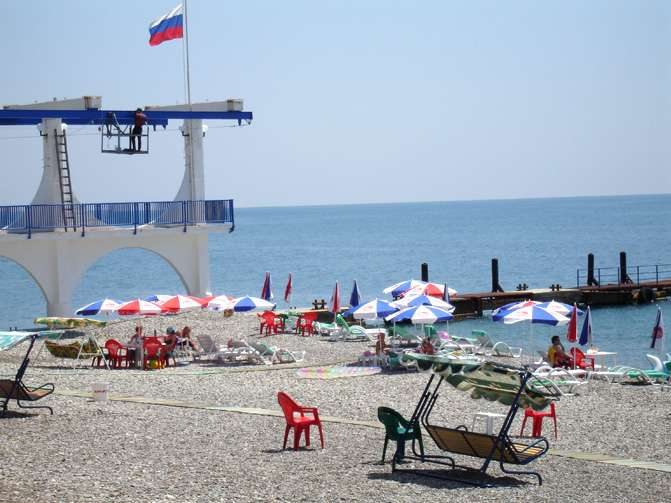Пансионат имеет свой собственный галечный пляж с террасой. Пляж находится в 500 метрах от жилого корпуса, и добраться до него можно с помощью лифтовых подъемников, бесплатного автобуса или десятиминутной, пешей ходьбой.