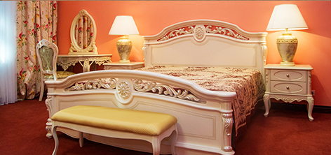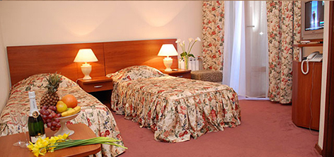 Двухместные однокомнатные номера повышенной комфортности представленны во всех корпусах, рассчитаны на проживание двух человек. Предусмотрены дополнительные места. Общая площадь от 25 кв.м. Номера оформлены по индивидуальным дизайнерским проектам, обставлены классической итальянской мебелью. В санузле площадью 9 кв.м. унитаз, биде, раковина, гидромассажная джакузи или ванна, душевая кабина.