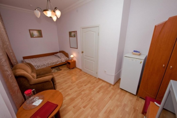 Комната: кровать 1.6 м., телефон, телевизор, эл. чайник, холодильник, мини-бар, раскладной диван, посуда.